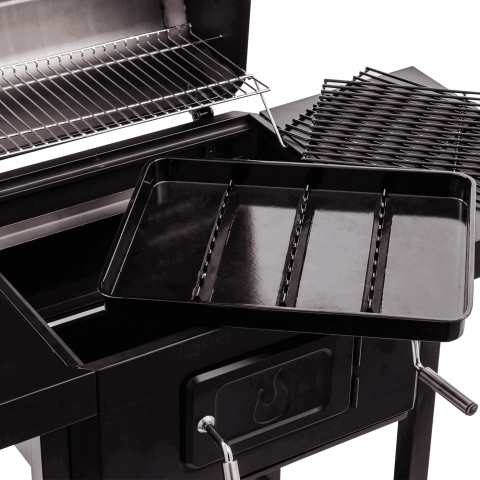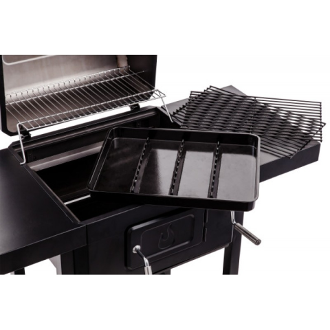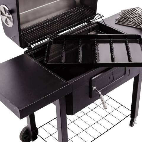 - Премиальные грили с термометром, зольником и вместительной решеткой. Решение для тех, кто любит собирать большие компании и часто жарит мясо. Металлический корпус отлично держит тепло, встроенный термометр помогает контролировать температуру.