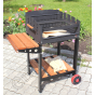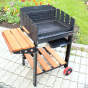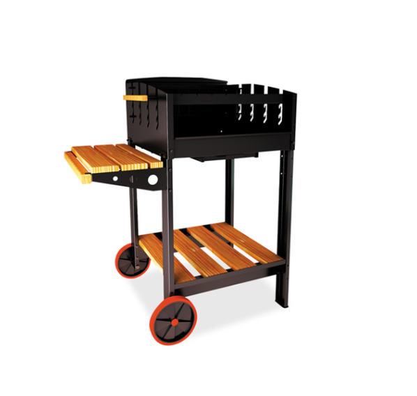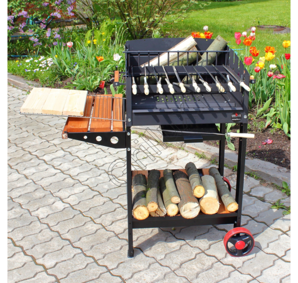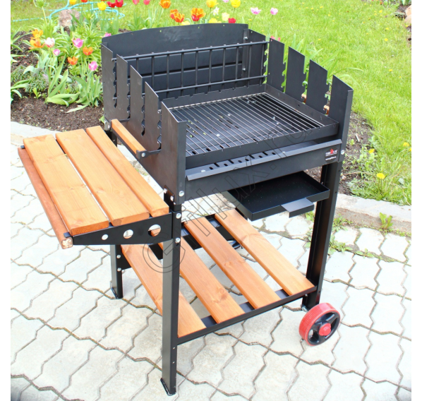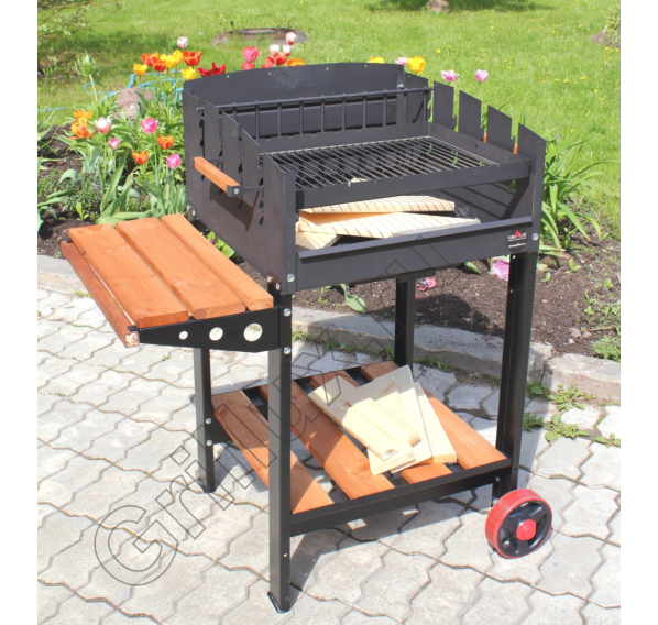 В качестве топлива имеется возможность использовать обычные дрова и специальный уголь для мангалов. Для сбора пепла предусмотрен удобный зольный ящик, обеспечивающий быструю чистку конструкции. Легко перемещать устройство на выбранное место можно с помощью установленных колес, а от непогоды Ваше мясо защитит специальная крыша (приобретается отдельно).