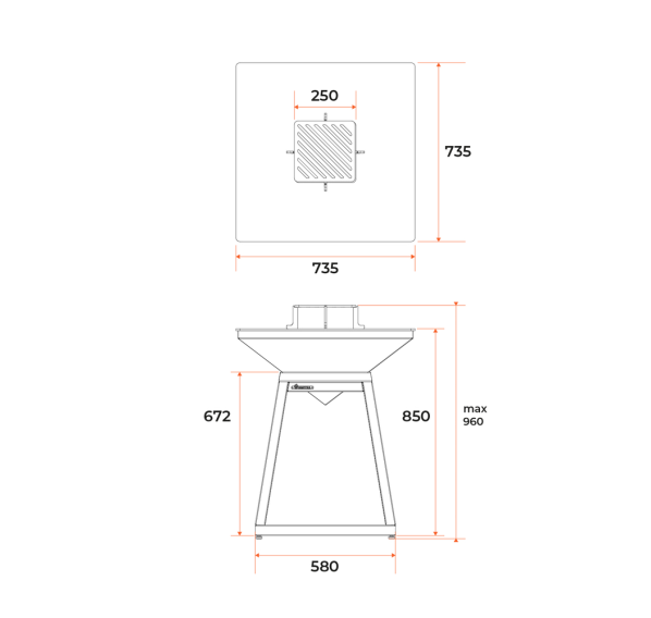Жарочная поверхность толщиной 8 мм выполнена из высокоуглеродистой стали, а внушительный размер поверхности 73,5x73,5 см позволяет накормить компанию до десяти человек. Для исключения деформации жарочная поверхность усилена мощной рамой, помимо этого поверхность имеет уклон к центру для стока жира и сока.