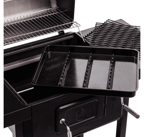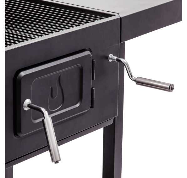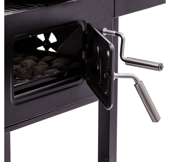 Важное преимущество прилей Performance, это возможность гибкого управления жаром на решетке. Регулируя высоту поддона для угля при помощи ручки, Вы сможете увеличить или уменьшить жар на решетке. А через дверцу для доступа к углю сможете сдвигать его, для создания зоны непрямого жара. Или просто добавить свежего угля. Ну и конечно заслонки поддува есть как в нижней части, так и на крышке гриля. В крышку также вмонтирован термометр.