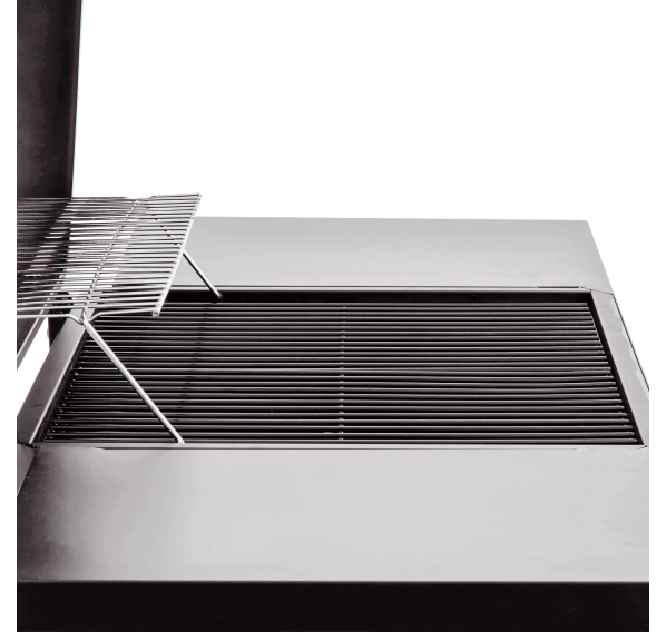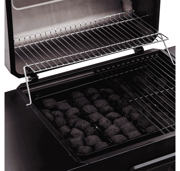 Прочная основная решетка и дополнительная решетка для подогрева, покрыты фарфоровой эмалью. Выдвижной поддон позволяет легко удалить золу и пепел после жарки. Широкие пристолья дают достаточно места для комфортной готовки, на нижней полке можно хранить уголь. При помощи увеличенных колес гриль легко перемещать по участку.