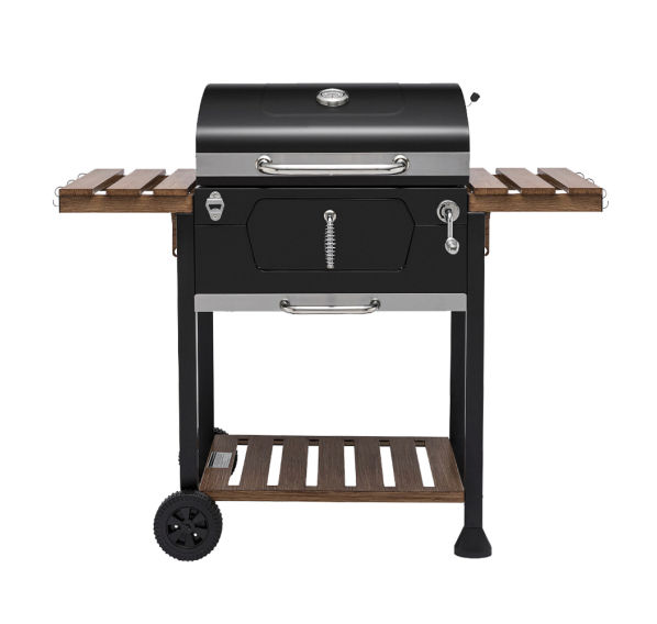 На гриле есть специальная ручка, позволяющая поднимать и опускать поддон с углями, а также заслонка, регулирующая подачу воздуха. Изменяя расстояние от углей до продуктов и силу потока воздуха, можно контролировать жар в гриле. А отслеживать температуру удобно на встроенном термометре.