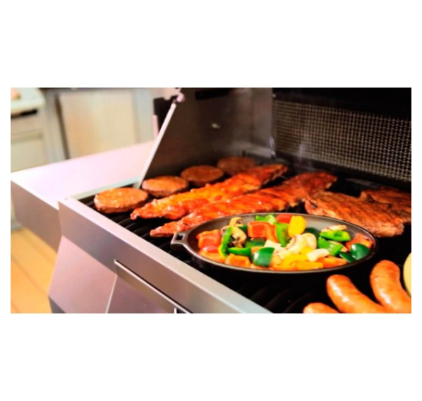 Гриль угольный, задняя съемная горелка, двухсторонняя чугунная решетка, регулируемый поддон для угля, боковые пристолья 2 шт., всепогодные колеса с стопорами 4 шт.