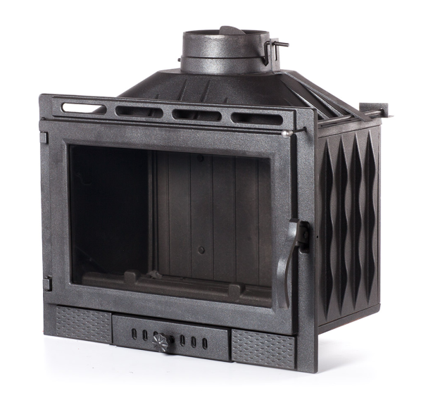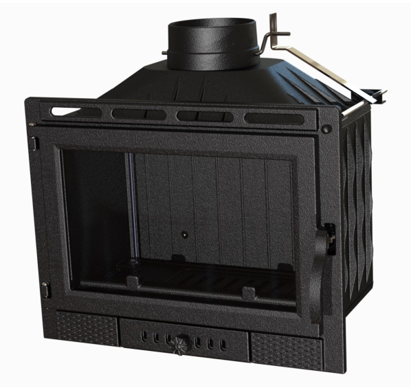 Топка Dagmar с большим дымосборником удобна и безопасна в эксплуатации. Перегородка внутри печи препятствует выпадению углей из топки, большой зольный ящик не требует частой очистки. Загрузка топки - фронтальная, она вмещает до 2,5 кг дров. Топка отличается высоким КПД и мощностью (10 кВт), для дополнительного съема тепла приварены ребра жесткости. Все это позволяет быстро обогреть помещение площадью до 100 кв.м. Интенсивность горения регулируется с помощью заслонки в нижней части топки.