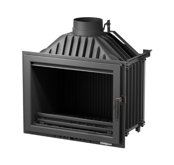 Каминная топка Torn – чугунная закрытая модель кассетного типа с прямым жаропрочным стеклом, верхним подключением к дымоходу и дверцей с боковым открытием. Производитель – зарекомендовавший себя на мировом рынке высоким качеством и долговечностью отопительных приборов польский бренд Nordflam. Топка изготавливается из чугунных отливков, которые соединяются посредством подгонки, скрепляются огнеупорным герметиком, закрепляются болтами и гайками. Система ребер жесткости имеет зигзагообразную форму, что создает дополнительные теплообменные поверхности и увеличивает теплоотдачу.