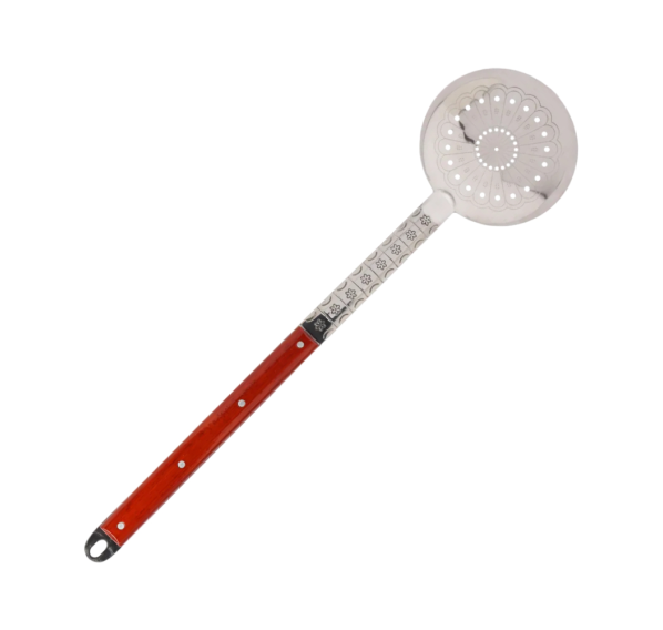 Кухонная принадлежность в виде большой плоской ложки с множеством мелких отверстий в черпале для прохождения жидкости. Шумовка выполнена штамповкой из единого листа нержавеющей стали. Деревянная ручка имеет отверстие для подвешивания и не нагревается при готовке.