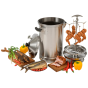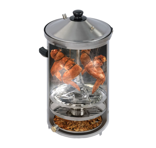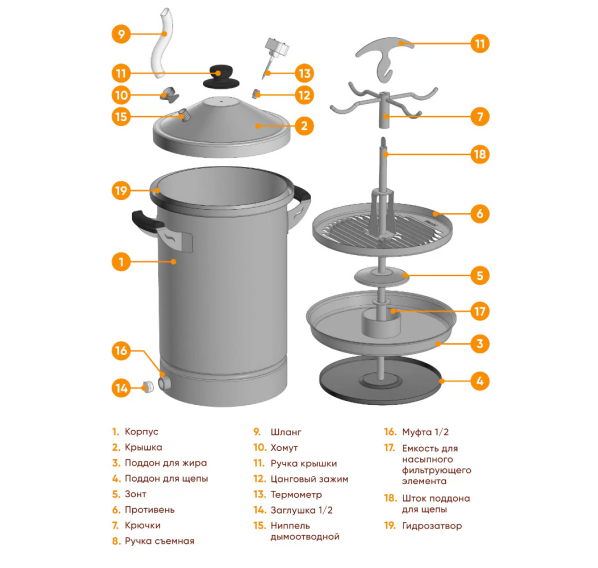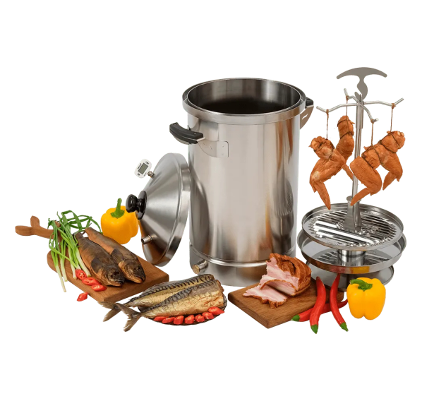 В комплекте с устройством идут крючки для подвешивания, поддоны для выкладки продуктов, противень для жира, насадка для курицы и противень для щепы. Всё это облегчает копчение и делает весь процесс более приятным.