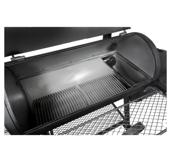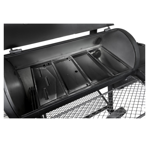 Высокопрочная конструкция жаровни выдерживает экстремальные температуры, даже при копчении дровами. Жаровня снабжена съёмным стальным ящиком, для удобной очистки от пепла и грильной решёткой. Имеет удобную заслонку поддува и ненагревающиеся ручки. Просторная камера копчения с крупным, легкочитаемым термометром на крышке. При желании можно самостоятельно вкрутить второй термометр (не входит в комплектацию) для идеально точного контроля температуры в камере. Для удобства работы имеется фронтальная полка и широкая нижняя полка.