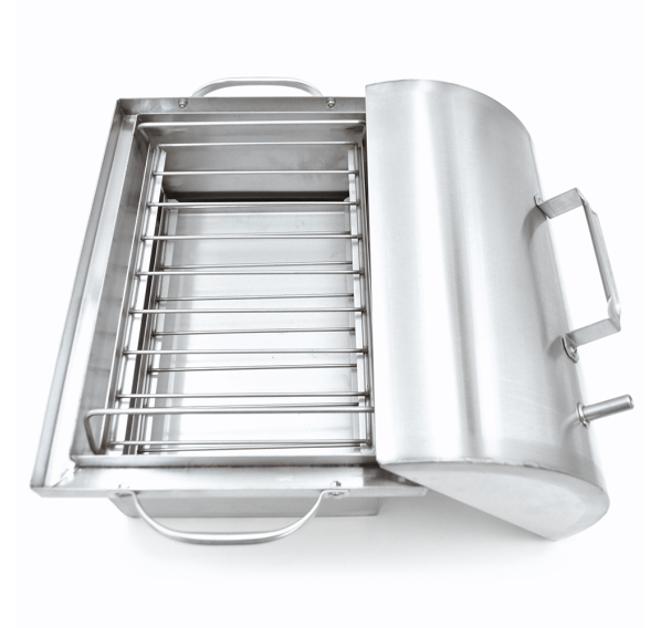 Две съёмные решётки для копчения и поддон для сбора жира с ручками для удобства закладки и извлечения продуктов. Решётки и поддон выполнены из нержавеющей стали.