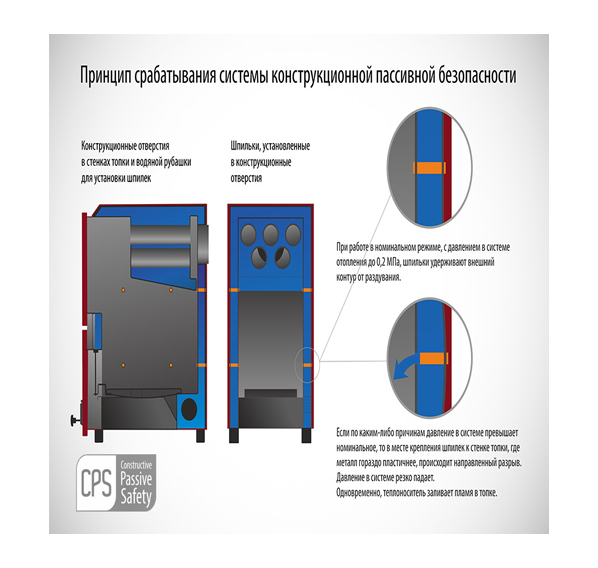 - запатентованная система безопасности «CPS» – конструкционное решение, снижающее тяжесть и силу последствий в результате аварии и делающее котел ремонтопригодным;