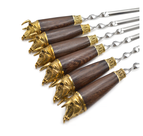 Ручки выполнены из дерева венге и художественного латунного литья в виде головы быка с кольцом.