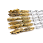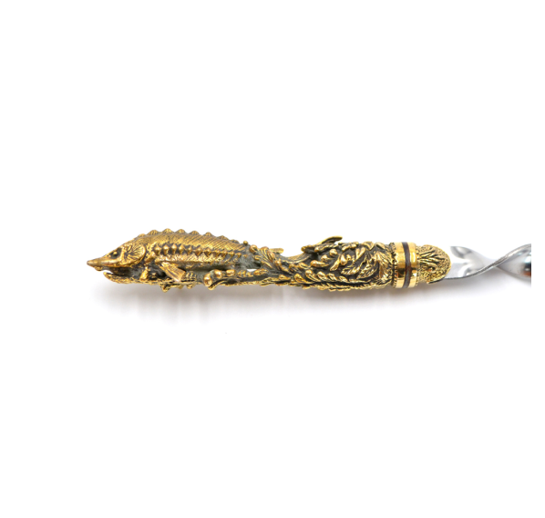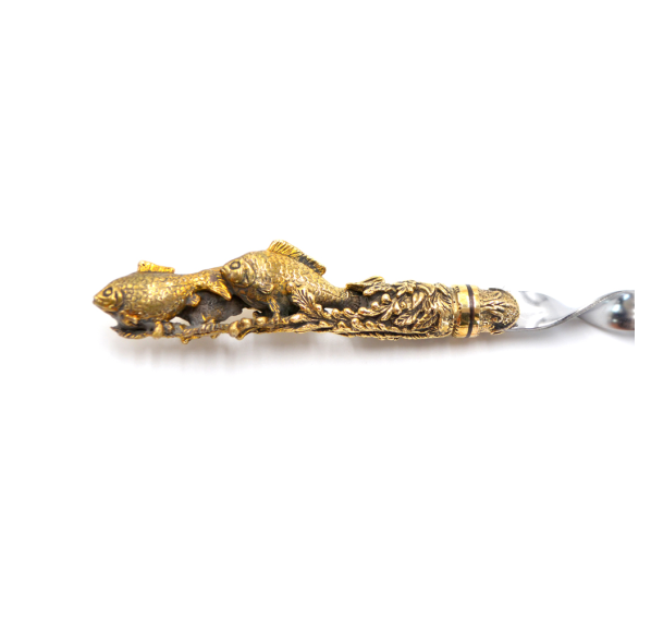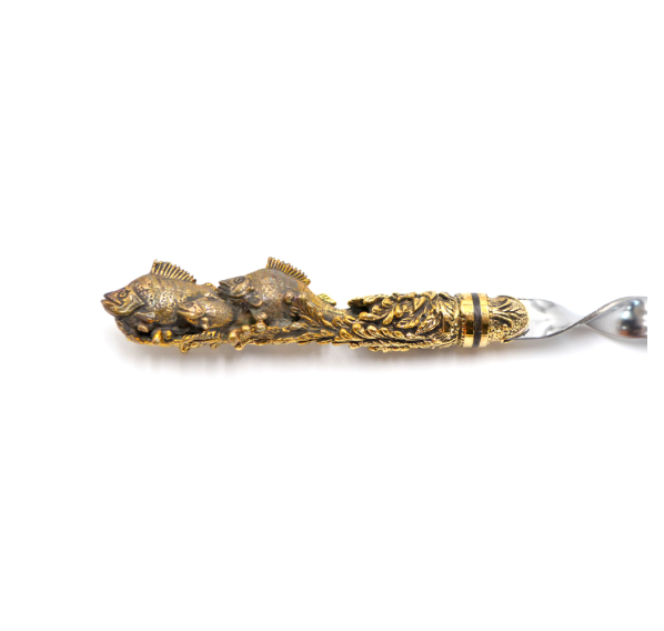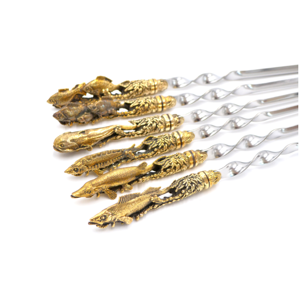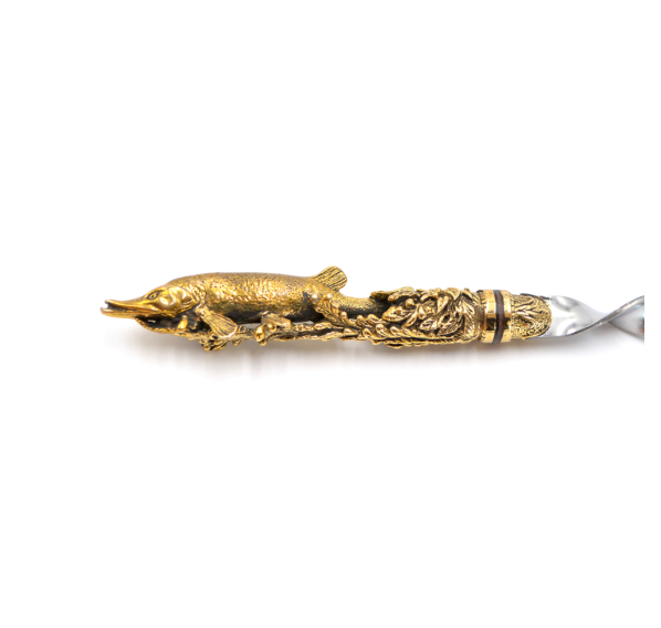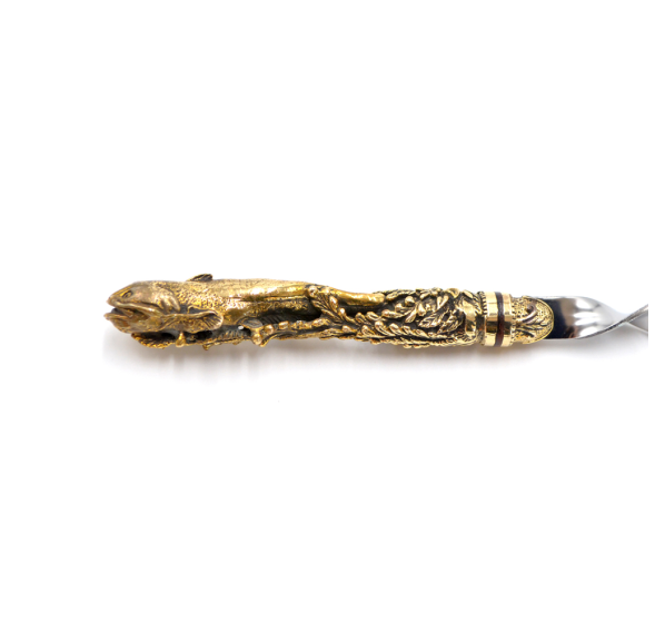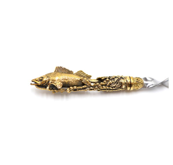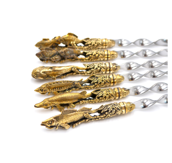 Ручки выполнены из художественного латунного литья в виде щуки, окуня, судака, карася, осетра и сома.