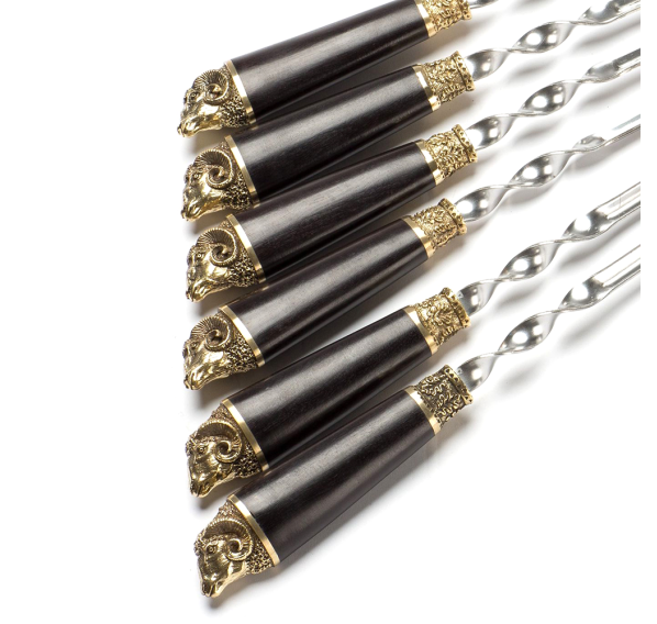 Ручки выполнены из дерева венге и художественного латунного литья в виде головы барана (овна).