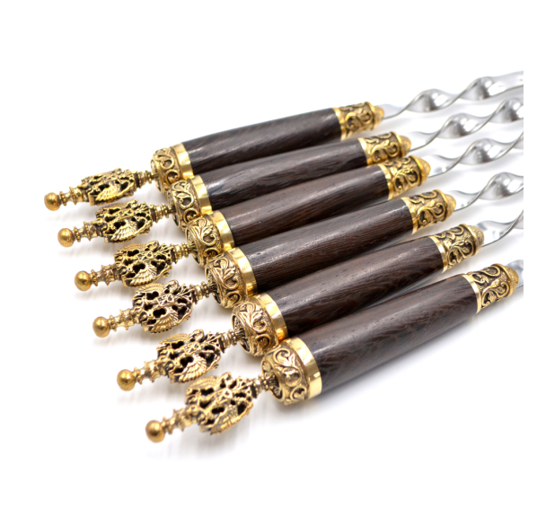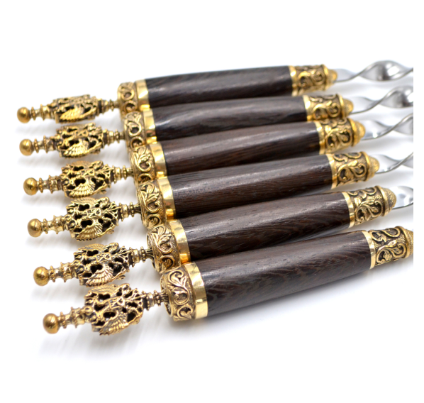 Ручки выполнены из дерева венге и художественного латунного литья в виде герба России. Эксклюзивный набор шампуров «Россия» не останется без внимания патриотами, любителями Родины, готовыми пожертвовать своими интересами ради неё! Отличный подарок шефу или руководителю, мужу или отцу!