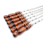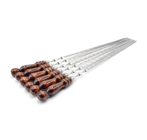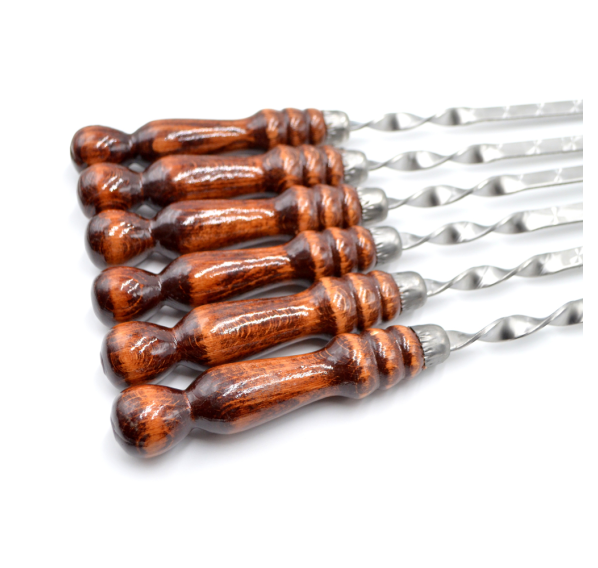 Набор шампуров ручной работы, которые изготовлены из высококачественной нержавеющей стали толщиной 3 мм с деревянными ручками из древесины лиственных пород (берёза), в процессе эксплуатации не рассыхаются и не выделяют смолу.