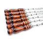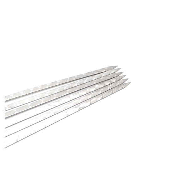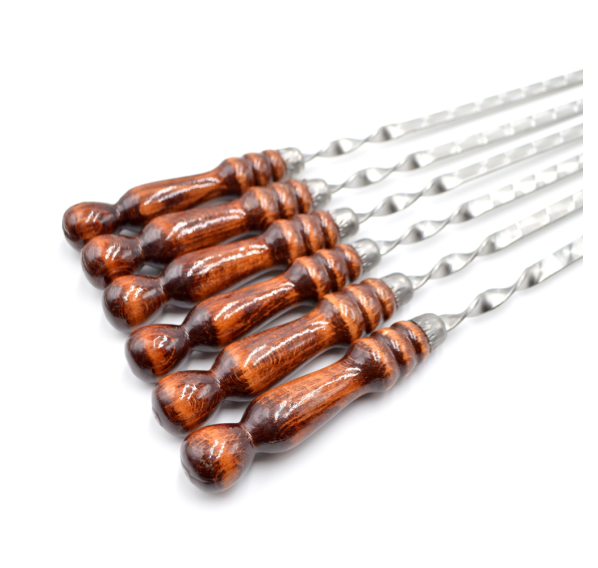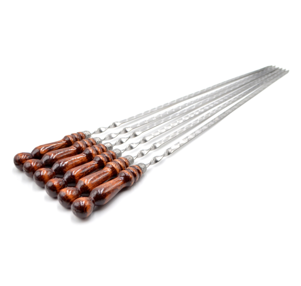 Набор шампуров ручной работы, которые изготовлены из высококачественной нержавеющей стали толщиной 3 мм с деревянными ручками из древесины лиственных пород (береза), в процессе эксплуатации не рассыхаются и не выделяют смолу.