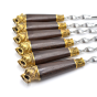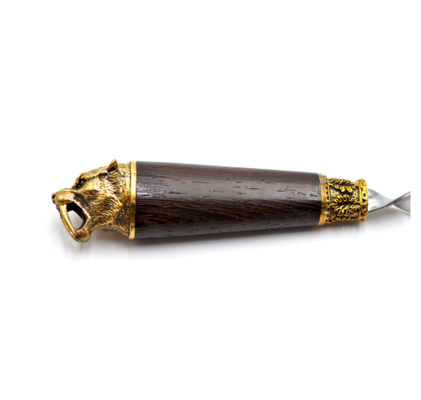 Ручки выполнены из дерева венге и художественного латунного литья в виде головы саблезубого тигра.