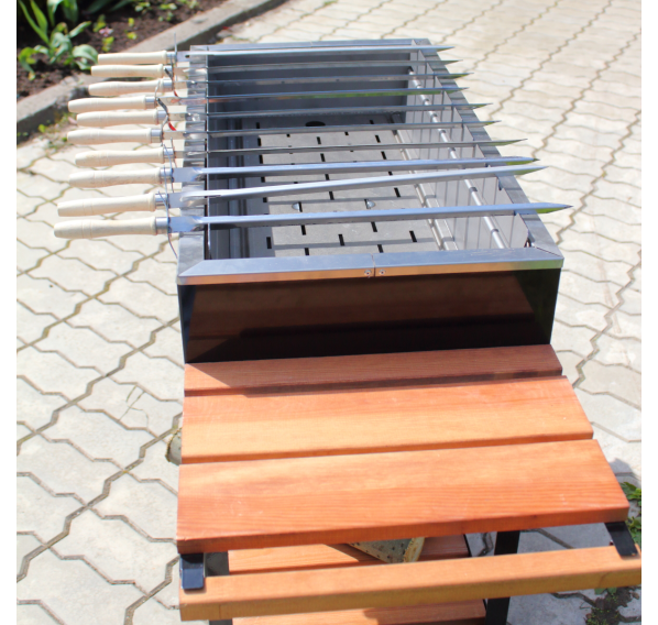 Мангал Grillux Master — это достаточно большое и удобное устройство для приготовления вкуснейших блюд из любимых продуктов на открытом воздухе. Предусмотренные колеса позволяют быстро и легко перемещать устройство на оптимально подходящее место для полноценного отдыха с кампанией друзей или родственников. Мангал изготавливается из качественной стали, покрашенной для более привлекательного вида. В конструкции имеются удобные и функциональные столики, отделанные прочной древесиной, способные выдержать вес приготовленных продуктов, кухонной утвари и других необходимых вещей.