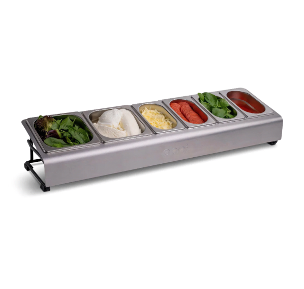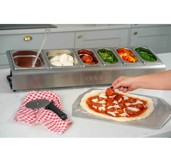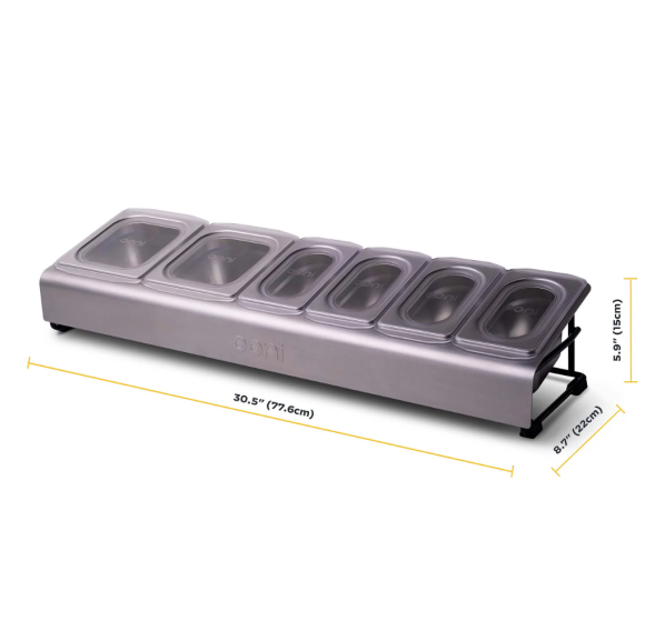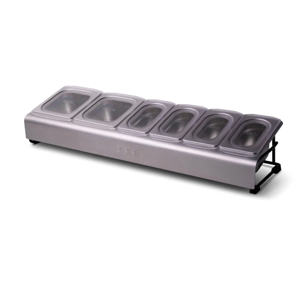 Бокс для топпингов Ooni — идеальный инструмент для подготовки ингредиентов и начинок. В комплекте два контейнера объёмом 1,6 л и четыре контейнера объёмом 0,8 л, которые гарантируют, что у Вас будет достаточно начинок, чтобы пицца не загустевала. Прозрачные крышки позволяют складывать контейнеры друг на друга и хранить в холодильнике. Погодостойкая рама с порошковым покрытием и основание из нержавеющей стали идеально подходят для уличных модульных столов Ooni. Постройте свою кухню на открытом воздухе и выведите приготовление пиццы на новый уровень.