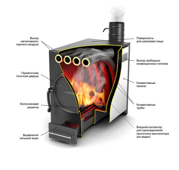 • Выдвижной зольный ящик позволяет одним движением, не прерывая горения, удалять золу. Встроенные конвективные теплообменные трубы увеличивают суммарную площадь поверхностей нагрева печи на 80%.