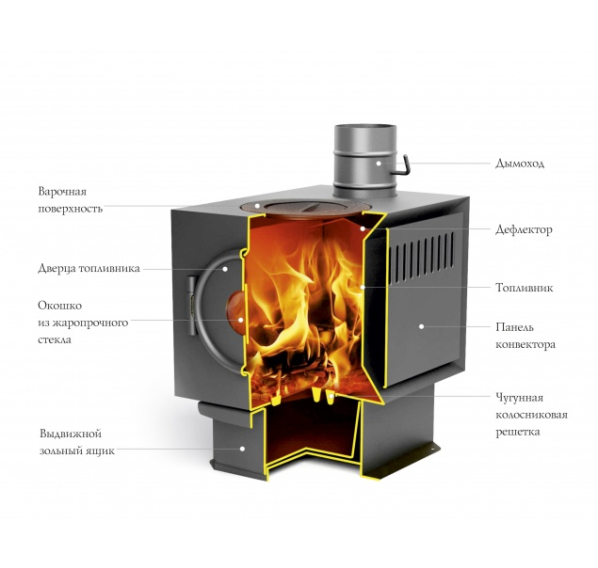 «Золушка» абсолютно оправдывает своё имя: работа печи незаменима, и в то же время неприхотлива. Конструкция изделия позволяет осуществлять приготовление пищи на его горизонтальной поверхности, а удачное геометрическое решение топки и боковое расположение конвекторов серьёзно экономят на топливном материале.