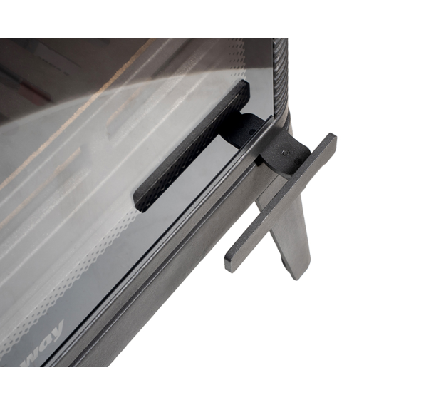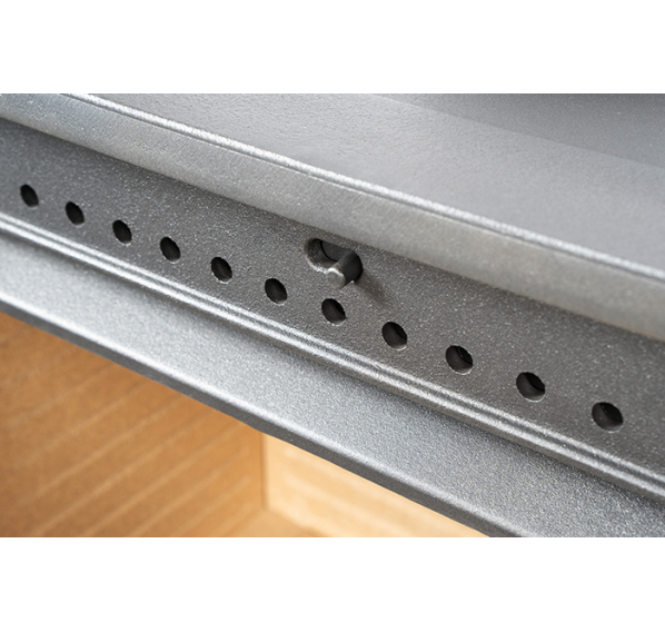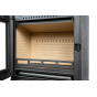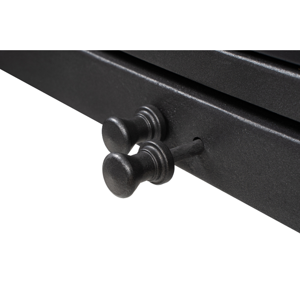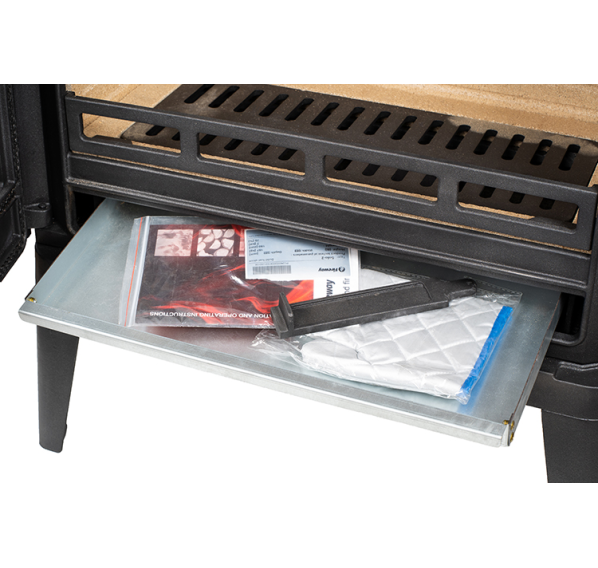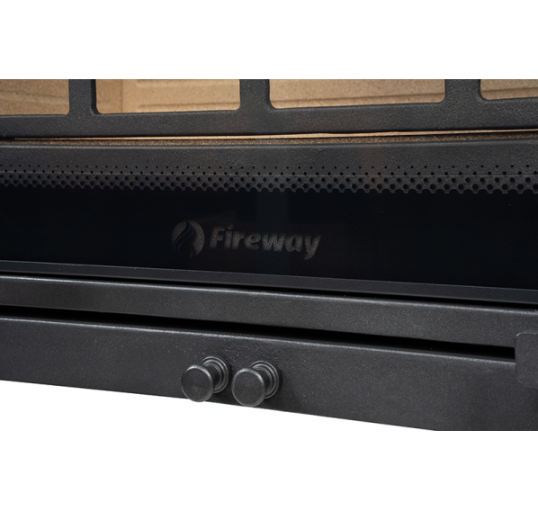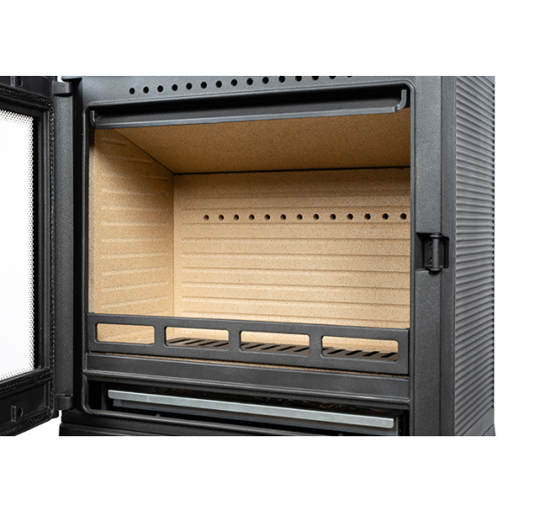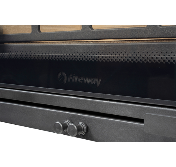 Топочная дверца подвешена на двух скрытых креплениях. Несмотря на внушительные размеры (диагональ стекла 67 см), она легко открывается (незаметная ручка расположена под дверцей) и герметично закрывается, препятствуя несанкционированному доступу кислорода в топку. За дверцей расположена защитная решетка для дров. “Соло 2” - печь колосникового горения. Под топкой находится усиленный зольный ящик большого объема. Печь проста в управлении: производитель предусмотрел отдельные регуляторы для подачи воздуха на колосник, на вторичный дожиг и на стекло.
