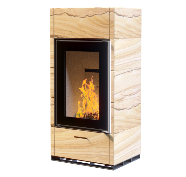 Производитель “Астов” предоставляет пять лет гарантии на печь-камин “Киви” в облицовке из песчаника.
