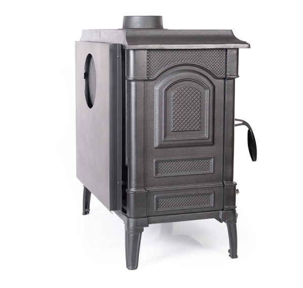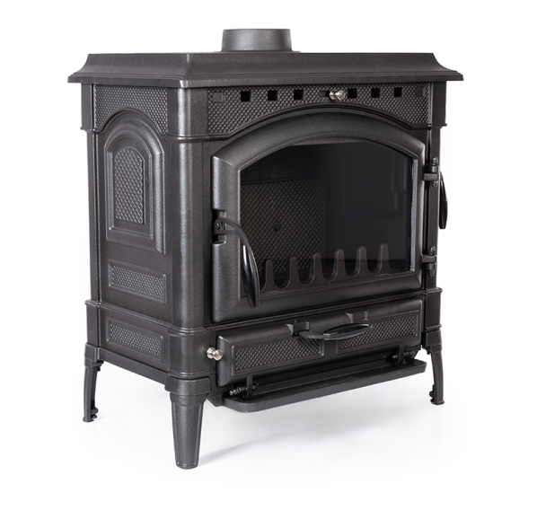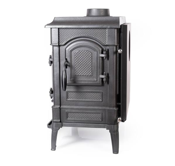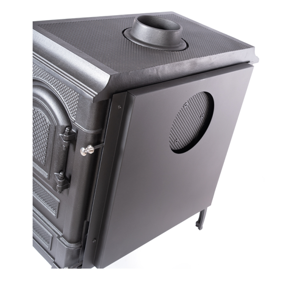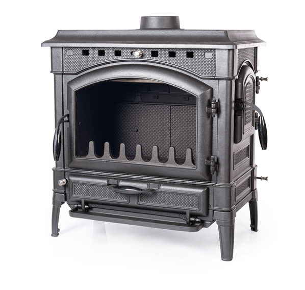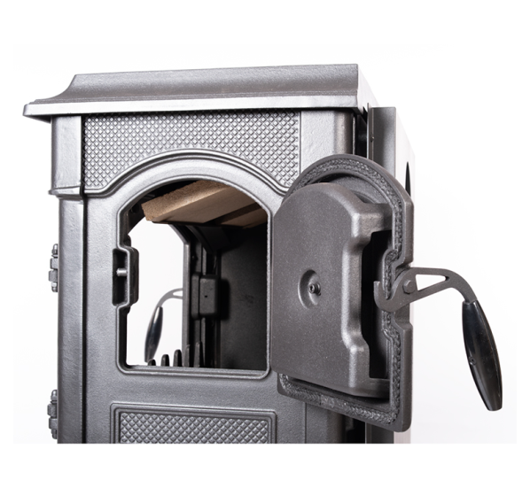 - Объемная топка, дополнительно усиленная чугунными панелями, вмещает поленья большого размера. Для удобства ее эксплуатации производитель предусмотрел небольшую боковую дверцу. Через нее легко загружать дрова, а ее открывание не приводит к резкому изменению давления внутри печи, поэтому дым и прочие продукты горения в помещение не попадают.