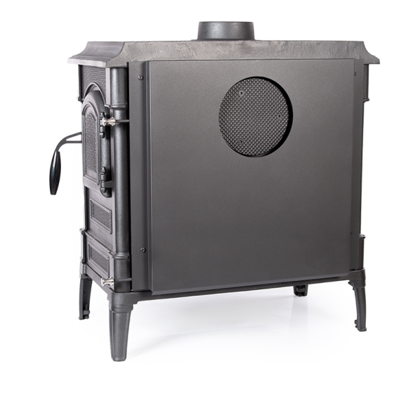 Печь рассчитана на пристенную установку. Дымоход можно вывести как сверху, так и сзади. Производитель предоставляет пять лет гарантии на чугунную печь-камин Jazz.