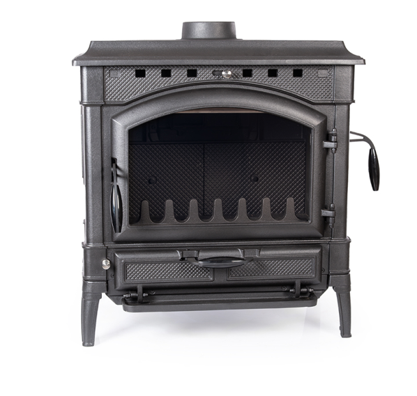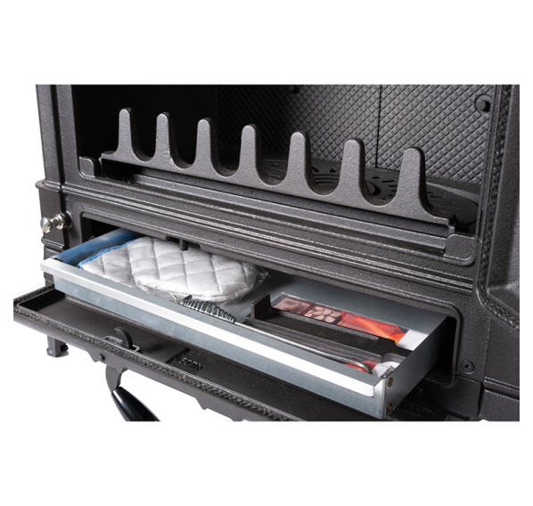 - Джаз - печь колосникового горения. Под колосниковой решеткой, закрытый изящной откидной дверцей, расположен объемный зольный ящик. Для принудительного сброса золы с колосника можно использовать специальный рычаг, расположенный слева от дверцы. Кстати: все ручки на печи защищены специальным термопластиком, который не нагревается до высоких температур, однако мы все равно рекомендуем использовать защитные перчатки - они идут в комплекте с отопительным прибором.