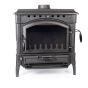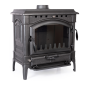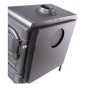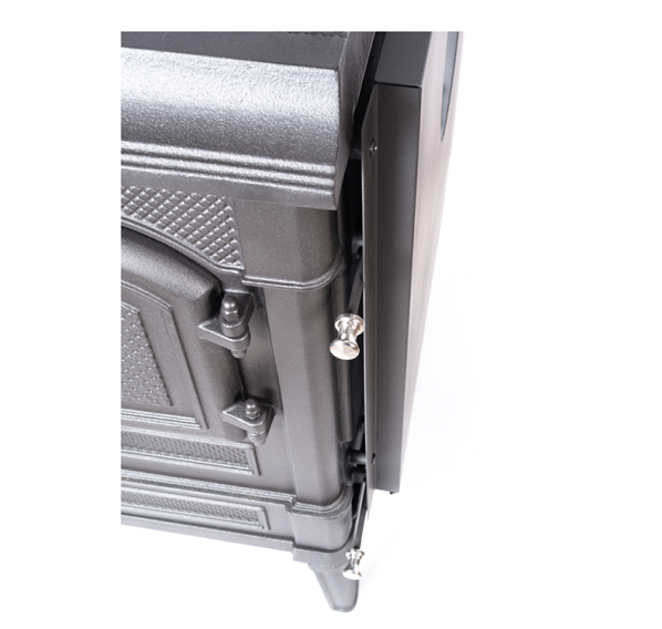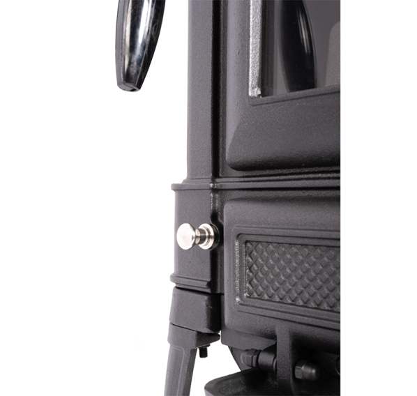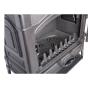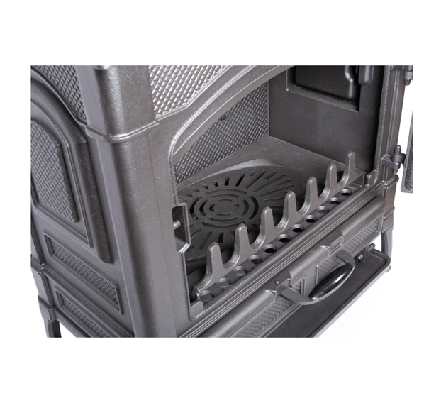 - Фронтальная дверца с большим стеклом обеспечивает отличный обзор пламени. В процессе работы печи она не запотеет и не испачкается - за чистоту и прозрачность отвечает система подачи теплого воздуха. Для защиты стекла от механических повреждений в передней части топки расположена высокая съемная решетка.