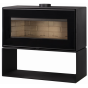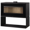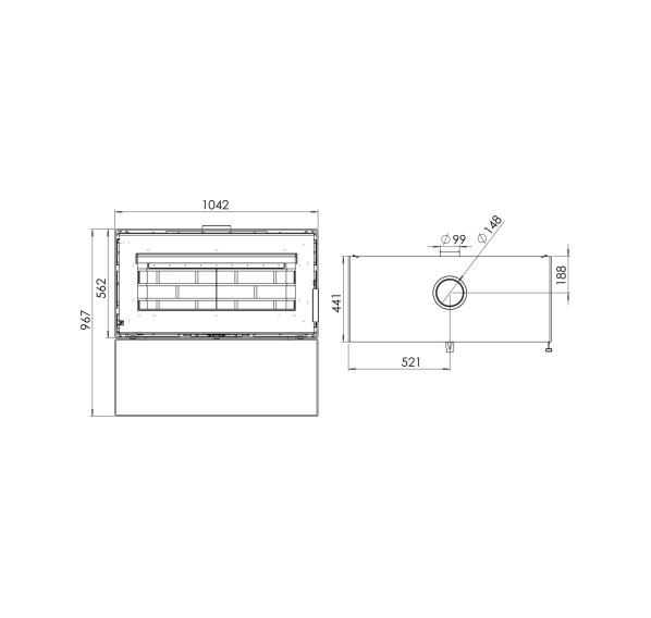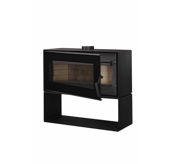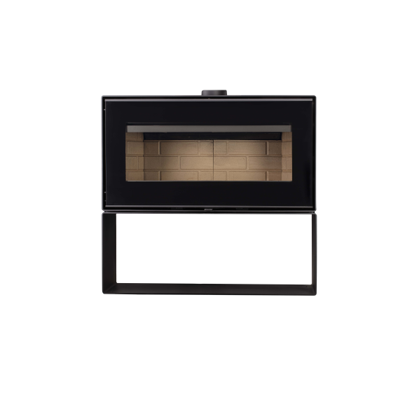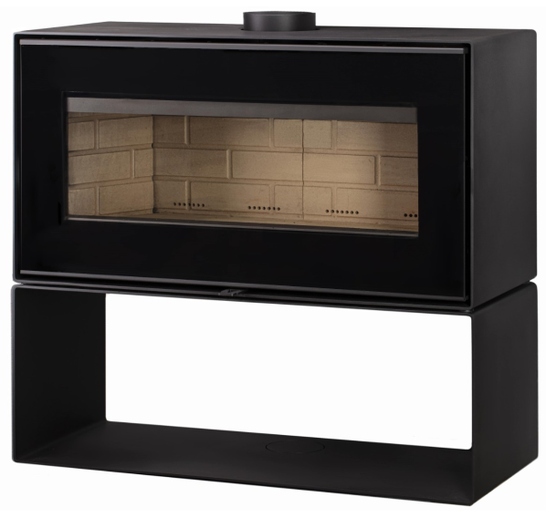 Горизонтальная печь-камин “Монблан” с цельностеклянной дверцей и огромной прямоугольной топкой - это, пожалуй, одна из самых эффектных моделей в линейке домашних отопительных приборов от бренда “Мета-Бел.” Ничто не отвлекает от обзора пламени - из элементов управления только небольшой рычаг регулировки подачи воздуха на горение находится на передней панели, в то время как ручка дверцы является съемной. Тяжелую верхнюю часть печи компенсирует изящная подставка-ниша.
