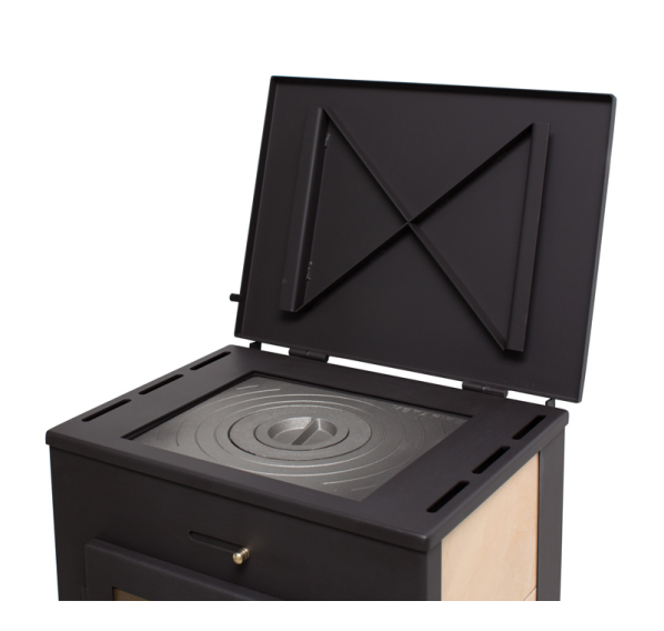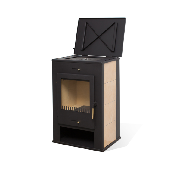 Печь-камин “Охта” от белорусского бренда “Мета-Бел” - универсальный вариант для установки в дачном доме или коттедже. Печь не только обогреет помещение, но и заменит мини-кухню или выступит в качестве резервного прибора для приготовления пищи на случай отключения электричества или газа - для этого в верхней части корпуса установлена чугунная варочная панель. Благодаря спокойному дизайну и традиционной форме эта пристенная печь отлично впишется в любой интерьер. Строгость угольно-черных граней оттеняется облицовкой светлой керамикой, а большая дверца обеспечивает отличный обзор пламени.