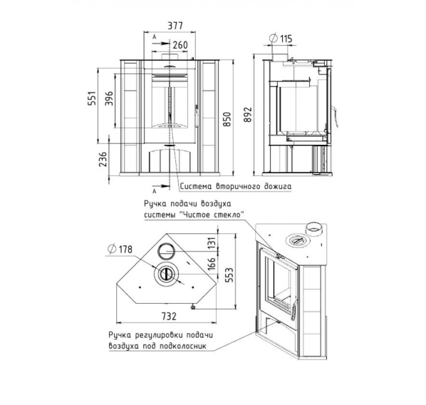 - Встроенная система двойного дожига гарантирует полное сгорание дров, уменьшает выброс вредных газов и способствует аккумуляции тепла внутри топки, повышая КПД прибора.
