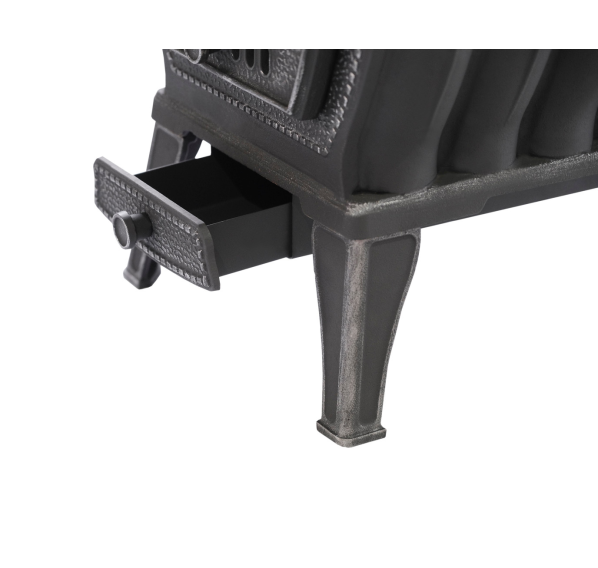 Печка не требует трудоемкого ухода: система “чистое стекло” защищает прозрачный фасад дверцы от запотевания, оседания сажи и копоти. Вместительный зольник легко очистить, а наполняется он медленно - благодаря высокому КПД камина дрова прогорают практически полностью. Снаружи печь покрыта жаростойкой краской, защищающей поверхности от повреждений и придающей чугуну благородный антрацитовый оттенок.