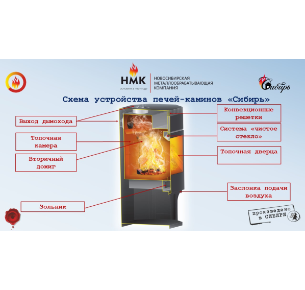 Печка от Новосибирской Металлообрабатывающей компании удобна в эксплуатации. Разработанная производителем система воздушной завесы предотвращает запотевание и загрязнение панорамного стекла сажей. Ручки управления горением эргономично расположены на дверце. Топка оснащена удобным ограничителем для дров. Он не только помогает компактно разместить поленья внутри печи, но и препятствует их выпадению и повреждению дверцы. В качестве топлива можно использовать сухие дрова и топливные брикеты. Снаружи стальные стенки печи защищены антрацитовой жаростойкой эмалью, которая легко очищается и препятствует появлению коррозии.