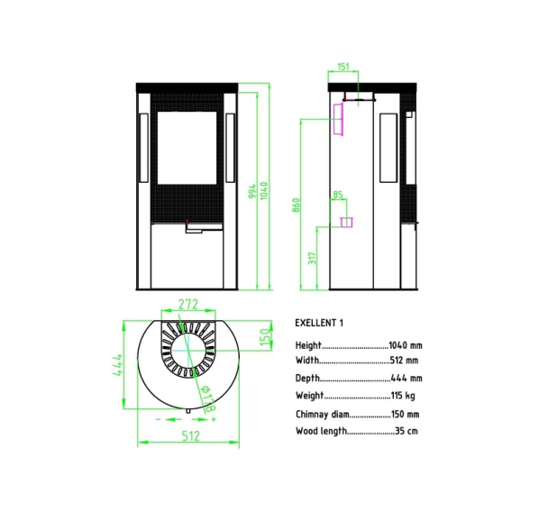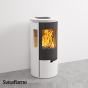 Печь-камин Excellent 1W привлекает внимание закругленной дверцей с большим термостойким стеклом без рамки. Черная дверца очень эффектно смотрится на фоне белого корпуса, графично подчеркивая геометрию печи. Дополнительный обзор пламени обеспечивают два вертикальных боковых стекла. Благодаря продуманной системе подачи воздуха они не запотевают и не покрываются сажей. Специальный фундамент для установки печи не требуется, достаточно негорючего основания, а возможность выбора верхнего или заднего вывода дымохода позволяет смонтировать камин в любом выбранном месте.