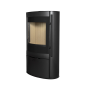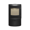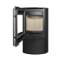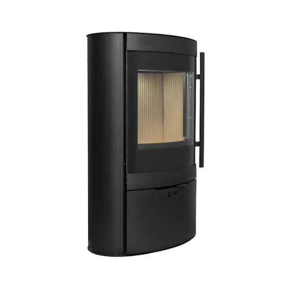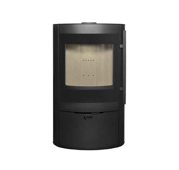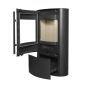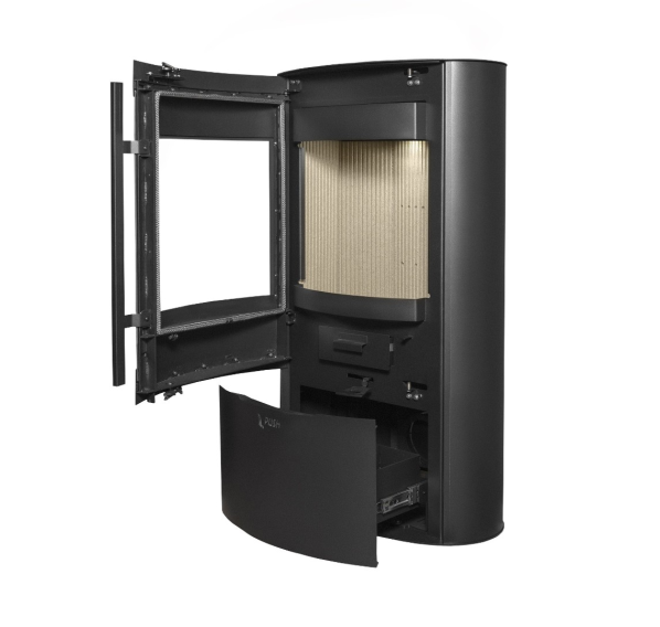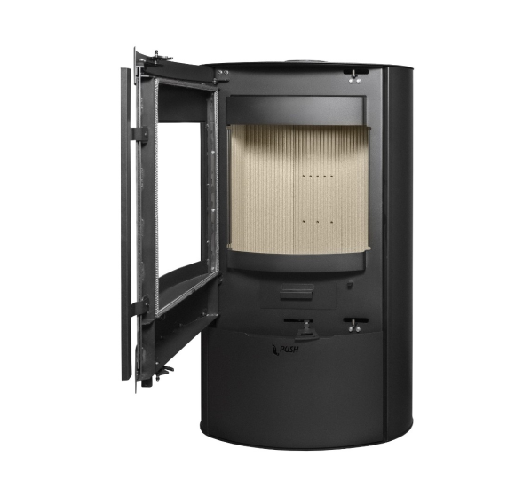 - Слегка изогнутая дверца топочной камеры с панорамным стеклом, оформленным по периметру шелкографией, обеспечивает отличный обзор пламени из любой части помещения. За прозрачность стекла отвечает система обдува горячим воздухом.
