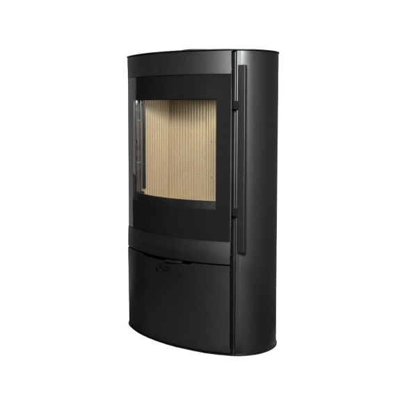 - В нижней части корпуса печи расположена большая закрытая ниша. Дверца на телескопических направляющих открывается простым нажатием. Ниша подойдет для подсушивания поленьев перед растопкой, туда же можно убрать печные аксессуары.