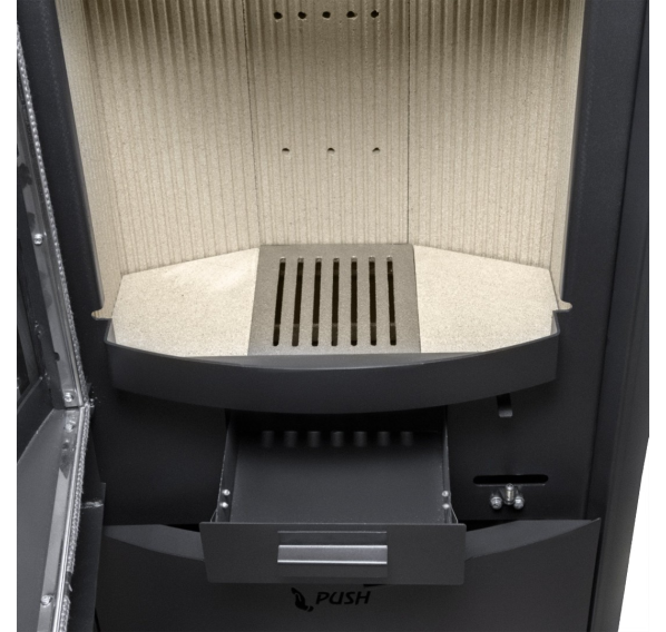 - Топка большого размера изготовлена из стали и дополнительно защищена футеровкой. Панели из вермикулита имеют ребристую поверхность. Колосниковая решетка чугунная, зольный ящик скрыт за дверцей.