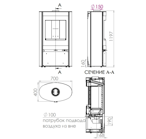 Печь-камин проста в монтаже: округлый, чуть сплюснутый корпус не занимает много места и подходит как для угловой, так и для пристенной установки. Дымоход выводится сверху.