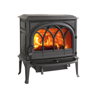 Отопительная печь закругленной формы, с большой стеклянной дверцей.