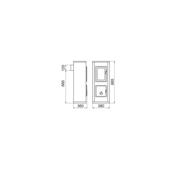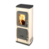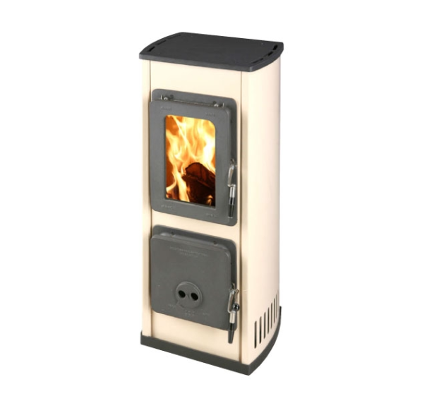 Дровяная отопительная печь с закругленными стенками, стеклом, с дополнительной крышкой и варочной поверхностью.