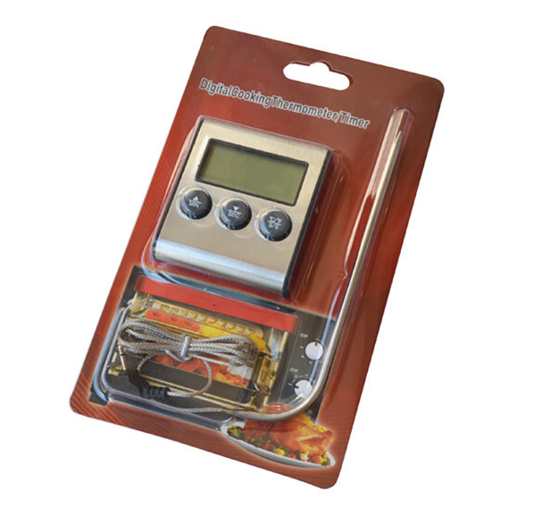 Цифровой электронный термометр с выносным датчиком щупом. Подаёт громкий звуковой сигнал при достижении заданной температуры. Все элементы полностью безопасны и надёжны, выполнены из термостойких, пищевых и химически-инертных материалов. Температурный диапазон измерения: от 0°С до +250°С, длина кабеля (датчика): 1 м.