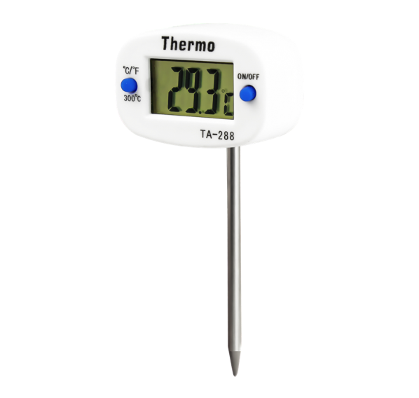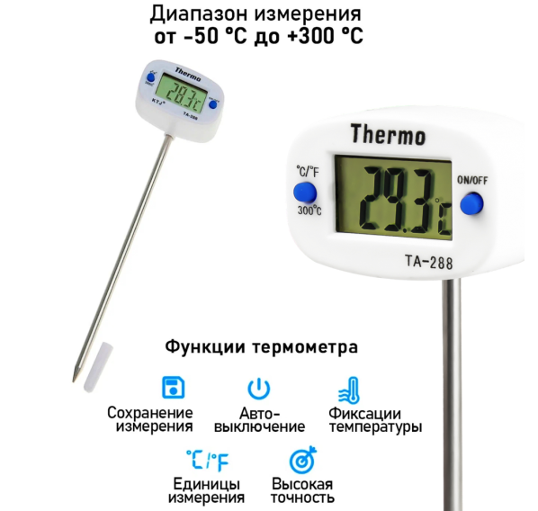 Цифровой термометр ТА-288 с длиной щупа 7 см и со встроенным поворотным ЖК-дисплеем предназначен для измерения температуры жидкостей, пищи, почвы и прочих субстанций. В самогоноварении чаще всего используется для контроля температуры в процессе перегонки самогона. Диапазон измеряемых температур от -50 до +300°C.