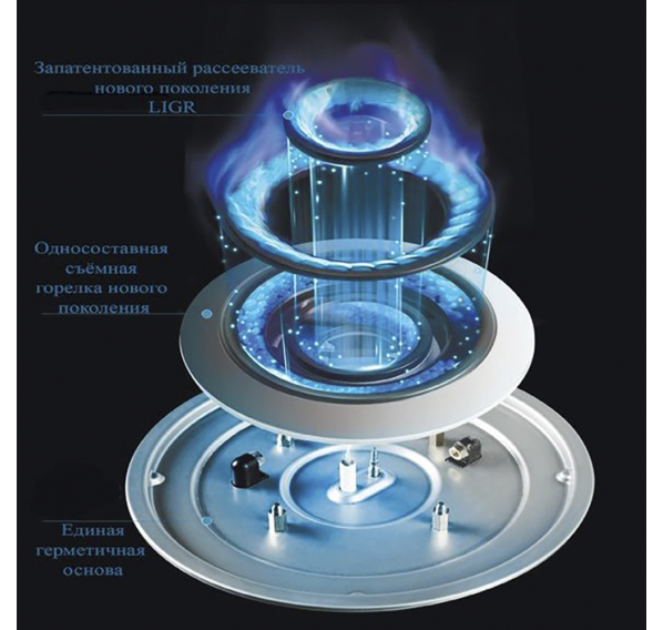 Главное преимущество — это запатентованная газовая горелка «LIGR». Она намного эффективнее евро-горелок. Её пламя извергается по спирали, и при низком потреблении газа охватывает большую площадь посуды и достигает больших температур. Инженерам удалось значительно увеличить КПД газовой плиты.