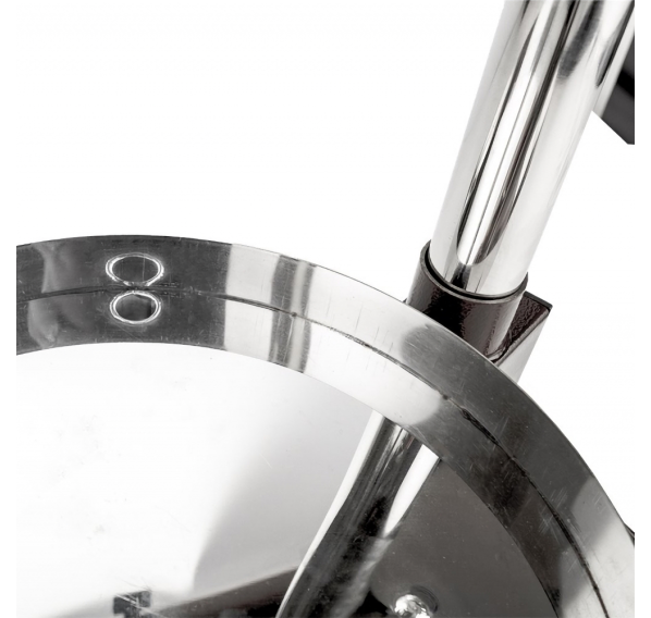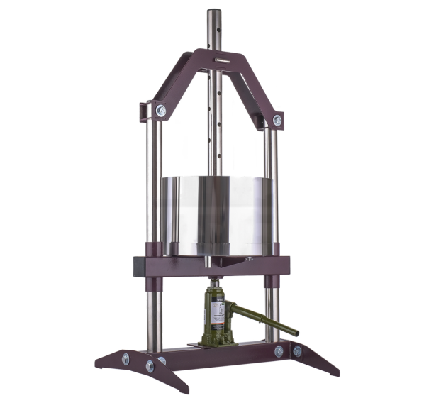 Элементом, создающим давление на сырьё, является гидравлический домкрат. За 1 цикл пресс может переработать до 18 кг фруктов, ягод или овощей. Особо прочная стальная рама обеспечивает долгий срок службы, толщина стенки верхней рамы 3 мм. В комплекте лавсановый мешок.