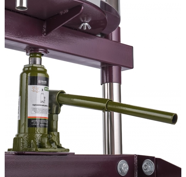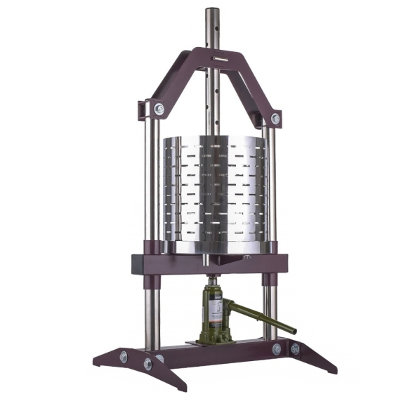 Элементом, создающим давление на сырьё, является гидравлический домкрат. За 1 цикл пресс может переработать до 18 кг фруктов, ягод или овощей. Особо прочная стальная рама обеспечивает долгий срок службы, толщина стенки верхней рамы 3 мм. В комплекте лавсановый мешок.