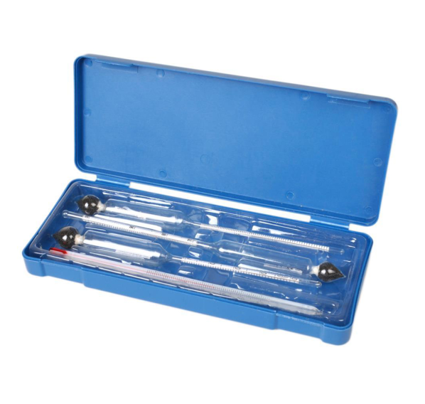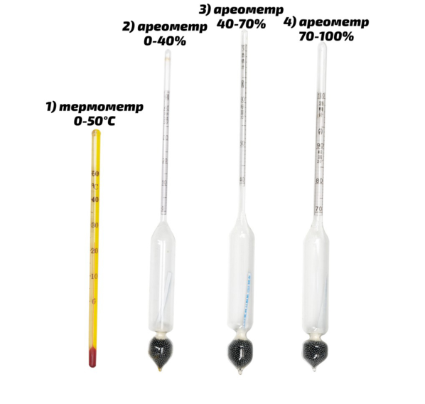 футляр, спиртометр 0-40%, спиртометр 40-70%, спиртометр 70-100%, термометр 0-50°C