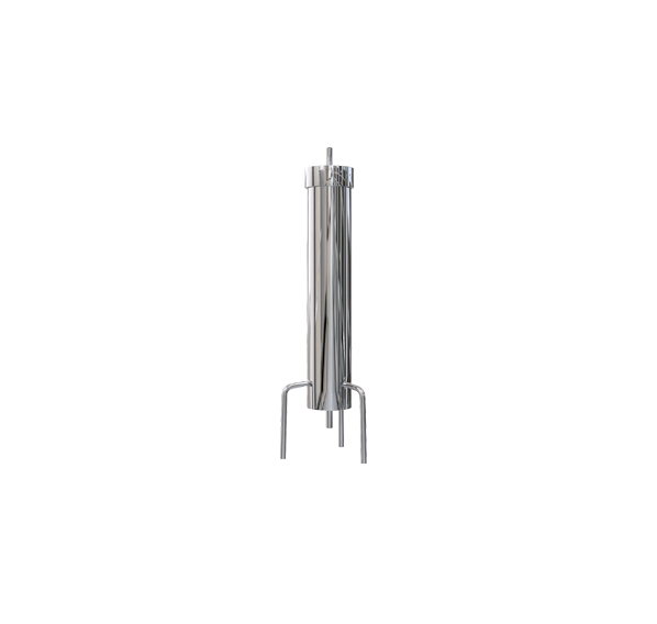 Угольная колонна представляет собой полый цилиндр на трех высоких ножках, в нижней части которого предусмотрен небольшой выпускной патрубок. Сверху предусмотрена плотно закрывающаяся крышка с впускным патрубком. Полость цилиндра заполняется специальным углем БАУ-А. Остается лишь подсоединить к верхнему патрубку выпускную трубку дистиллятора, по которой готовый продукт будет попадать внутрь угольной колонны в процессе перегона, а от нижнего патрубка отвести силиконовую трубку в емкость для сбора готового и очищенного продукта.